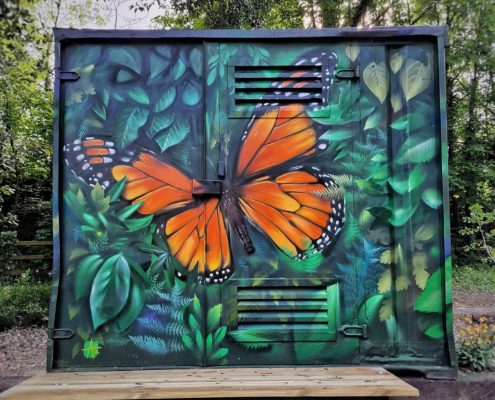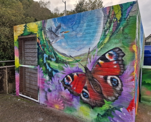 This mural was commissioned by Blackwood Youth Club and the Eco Park committee. Part of the design included a red and blue butterfly in memory of a local boy, Cole Roper, who was tragically killed when knocked off his bike in 2019. The mural…