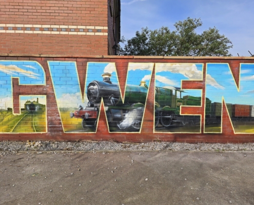 street art mural in Pillgwenlly. Graffiti art of a steam train. Sponsored by Pobl