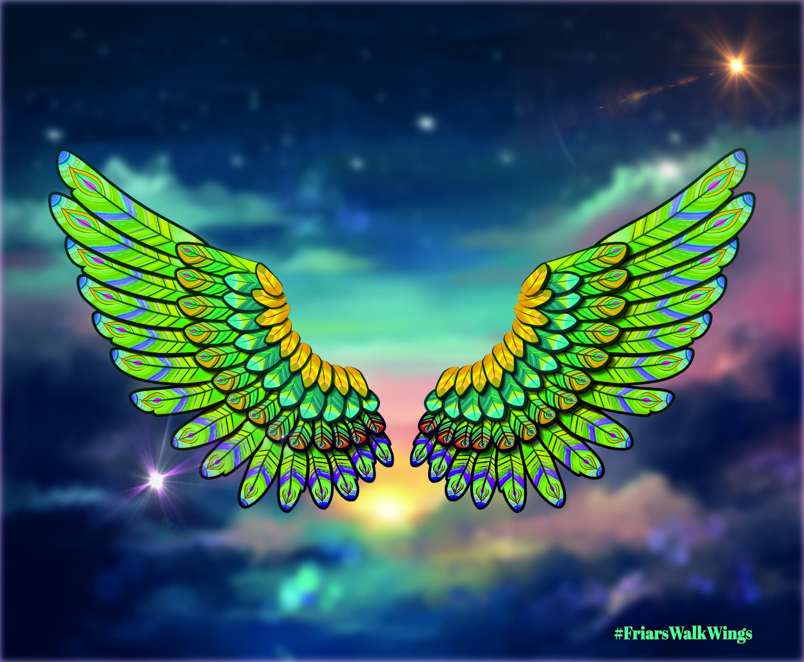 The first set was hand painted using spray paint and brushwork to create a fairly detailed patterned set of orangey wings. They were very much influenced by my bird doodles, which is my own personal version of art therapy. The wings were contrasted against a starry, space background. I was asked to add the #findyourwings hashtag by the marketing team at Friars Walk and you can check that out on Instagram to see all the wings around the world.