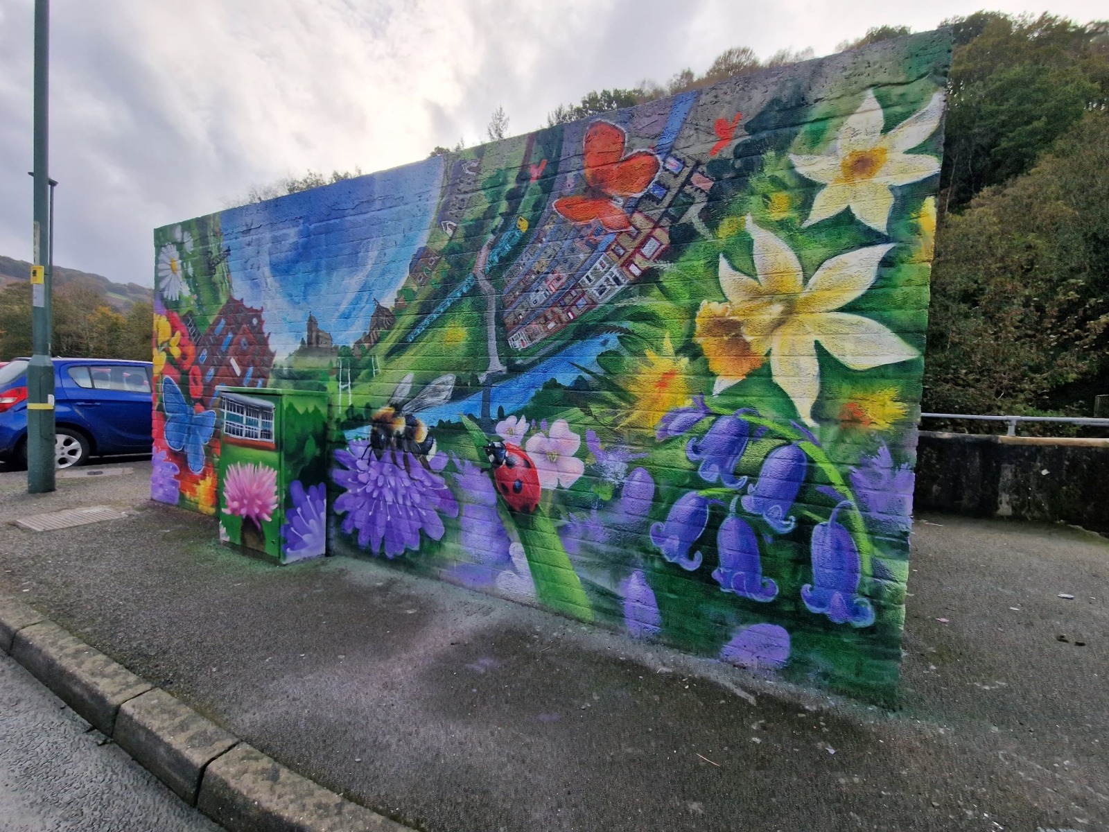 Painting the mural itself was a great experience. Llan is such a close-knit friendly community and every day people stopped to chat and tell me about the history of the area, ask lots of questions about what I was up to and make suggestions about what could be included . So lots of the mural was improvised in response to these chats.