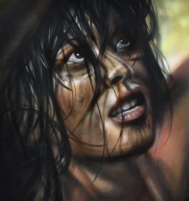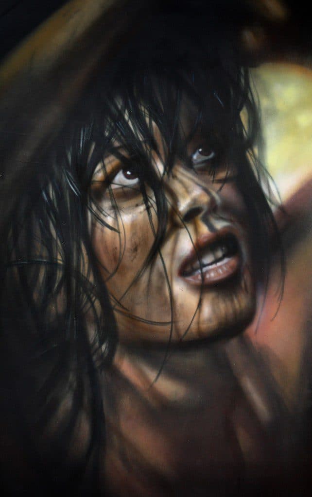 The original photos were from a shoot by Marion’s husband, Rhys. The paintings are all freehand aerosol on plywood and are around 4ft x 6ft.