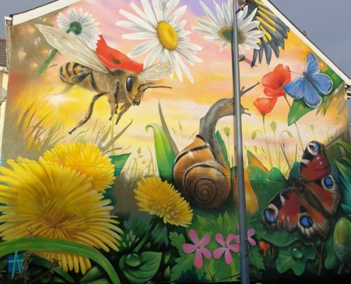 Graffiti spray mural painted for a school in South Wales. The mural features bees, butterflies, flowers and colourful insects.