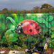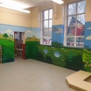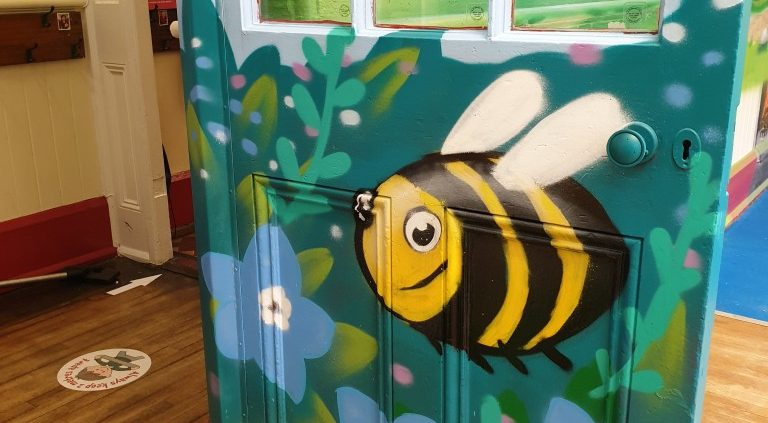 I’ve been lucky enough to be invited back to paint another ‘graffiti mural’ in Troedyrhiw Primary School during February half-term holidays. The theme was pretty open – big beach, lots of sky and green open spaces, a village and a busy bee on the classroom door.